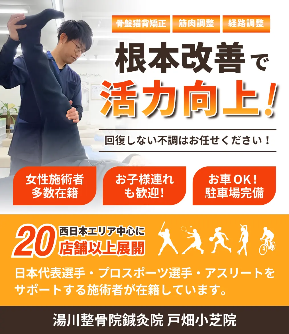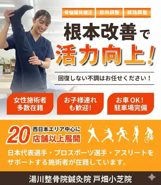 湯川整骨院鍼灸院 戸畑小芝院では平日19時まで営業しているため、仕事終わりの方や、部活終わりの学生さんも通いやすくなっております。なかなか治らない身体の痛みでお悩みの方は、お気軽にご相談ください。